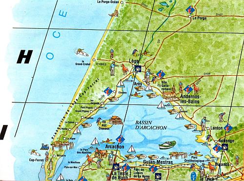 ein und zwar sehr heftig. Ab jetzt benutzen wir die Telefonzellen als Regenschutz, um überhaupt noch weiter zu kommen. Die Insel "Ille d`Oleron ist heute unser Ziel. Bei sehr starken Sturm müssen wir zwei lange Brücke überqueren um auf die Insel Oleron zu gelangen. Es wurde ein Kampf gegen Windböen und erforderte sehr viel Kraft um nicht gegen das Geländer oder auf die Straße gedrückt zu werden. Die vielen Autos rasen an uns vorbei, ohne Rücksicht. Radfahrer auf Ferntour, sind in ihren Augen Verrückte. Das können nur Deutsche oder Holländer sein...! Der Sturm wird noch stärker, wir sind in der Mitte der Brücke. Die Fahrräder mit den 30 Kilo Gepäck sind nicht mehr zu halten. Wir müssen schieben. Selbst das Schieben macht noch Schwierigkeiten. Es ist geschafft, wir sind auf der Insel Oleron angekommen. Gleich nach der Brücke legen wir einen Stopp ein, um uns in einem Restaurant bei einem Cafe zu erholen. Die Fahrt geht weiter. Unser neues Ziel heißt Boyardville. Dort soll es eine Fähre nach La Rochelle geben. Erst um 15.00 öffnet das Büro du Tourisme. Wir müssen warten. Um 15.00 erklärt man uns, das die Fähre erst in zwei Tagen fährt. Wir machen lange Gesichter. Zwei Tage, bei Sturm und Regen auf der Insel, unvorstellbar...
